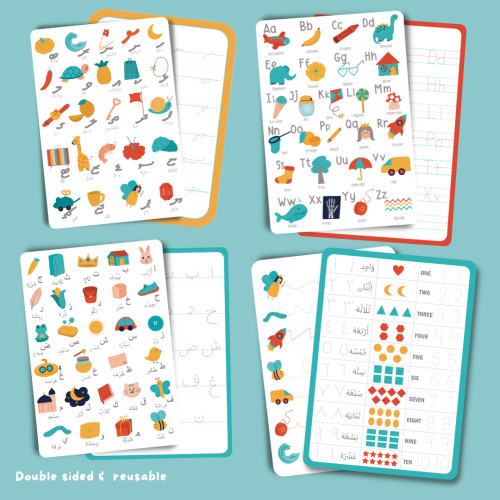 Erasable and reusable A4 sized cards to pratice Dhivehi/English/Arabic alphabets, line tracing and letter writing.