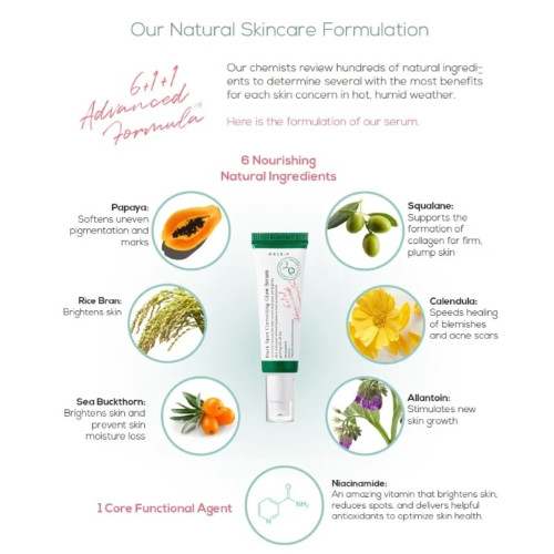 • The serum enhances skin’s glow by naturally reducing discoloration.
