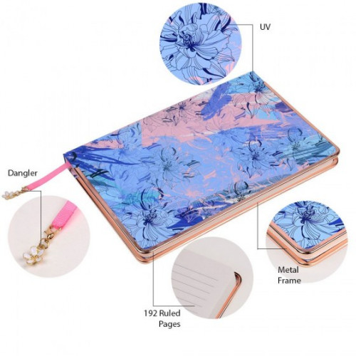 The floral design on the front and back of this hardcover diary continues inside onto the end pages. This metal frame diary comes with 192 ruled A5 pages that you can write, draw or doodle on. Adding a touch of style to this already glamorous journal is a copper metal frame and a theme-based dangler.