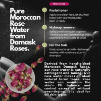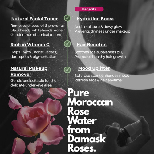 - Rich in Vitamin C: Moroccan rosewater is rich in vitamin C, which is great for acne, acne scars, dark spots, and hyperpigmentation