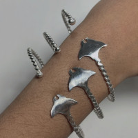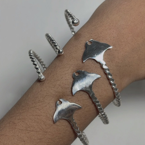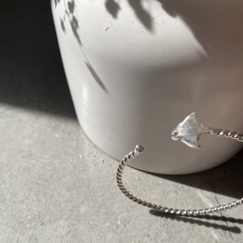 Hand forged in silver, this cuff twists like ocean currents, carrying the manta ray’s graceful silhouette. Inspired by Fuvahmulah’s waters, it embodies freedom, strength, and the quiet dance of the sea.