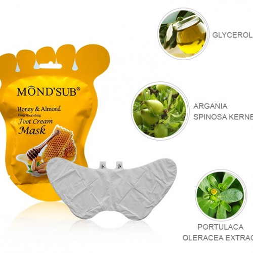 EFFECT: This formula rich with honey and almond extract, deep hydrate and moisturize skin, strengthen the skin glossy, make the skin of the feet elastic and smooth, return to tender and beautiful feet. USAGE: 1. Thoroughly wash and dry your feet. 2.Take out the sock, use scissors to cut off the top to open the mask and wear on your feet, peel off the tab on the adhesive strip to secure the top of the boot around your ankle(adhere tab to foot mask only not skin). 3. Remove the mask after 20-30 minutes, gently massage foot skin until the essence is completely absorbed. CAUTIONS: 1 Store it in a dry and cool place, avoid the direct sun exposure. Keep away from the reach of children. 2. l1 any discomfort or allergic symptom occurs, please discontinue using immediately and consult a doctor if necessary. INGREDIENTS: AQUA, GLYCERIN, PROPYLENE GLYCOL, UREA, MINERAL OIL, ETHYLHEXYL PALMITATE, PETROLATUM, GLYCERYL STEARATE, PEG-40 SORBITAN STEARATE, POTASSIUM CETYL PHOSPHATE, CETEARYLALCOHOL, PRUNUS AMYGDALUS DULCIS (SWEET ALMOND) OIL, STEARETH-21, BUTYLENE GLYCOL, PORTULACA OLERACEA EXTRACT, YEAST BETA-GLUCAN, STEARETH-2, DIMETHICONE TOCOPHERYLACETATE, SODIUM ACRYLATE/SODIUM ACRYLOYLDIMETHYL TAURATE COPOLYMER, ISOHEXADECANE, POLYSORBATE 80, SORBITAN OLEATE, PHENOXYETHANOL, HONEY EXTRACT, ETHYLHEXYLGLYCERIN, CHLORPHENESIN, CARBOMER, TRIETHANOLAMINE, HYDROXYETHYLCELLULOSE, XANTHAN GUM, DISODIUM EDTA, FRAGRANCE.