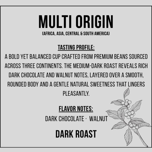 A bold yet balanced cup crafted from premium beans sourced across three continents. The medium-dark roast reveals rich dark chocolate and walnut notes, layered over a smooth, rounded body and a gentle natural sweetness that lingers pleasantly.