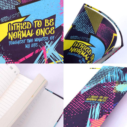 COVER STRUCTURE AND FEEL: The front cover of this diary features typography and geometrical shapes with some random shapes in raised UV.