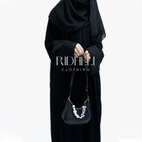 "The Rayat Black Embroidery Abaya combines elegance and comfort. Made from soft zoom material, this closed abaya features intricate black embroidery along the sleeves and hem.