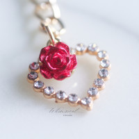 Handmade keyring with a red rose charm and a bejeweled heart charm.