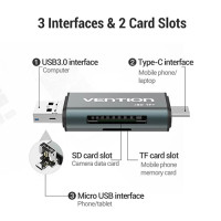 Vention CCHH0 USB3.0 Multi-function Card Reader Gray Metal Type