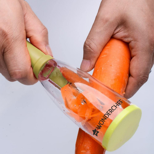A Peeler is a small item with a big application in every kitchen. A peeler must have a sharp blade and an ergonomic handle for a firm grip while peeling vegetables or fruits. Wonderchef Smart Peeler has all the qualities of a good, efficient peeler. But it is Smarter! It is smart since it comes with a built-in container that collects the skin of the vegetable or the fruit as you peel it. This prevents any messy after-work. Very compact in size, it can be carried anywhere and everywhere.